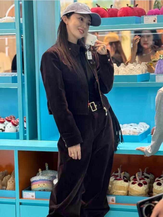 45歲的年紀,竟然又美又嫩,看着像二十出頭一樣。她帶着女兒小酒窩逛街,穿一件工裝風外套、高腰褲,又美又颯。