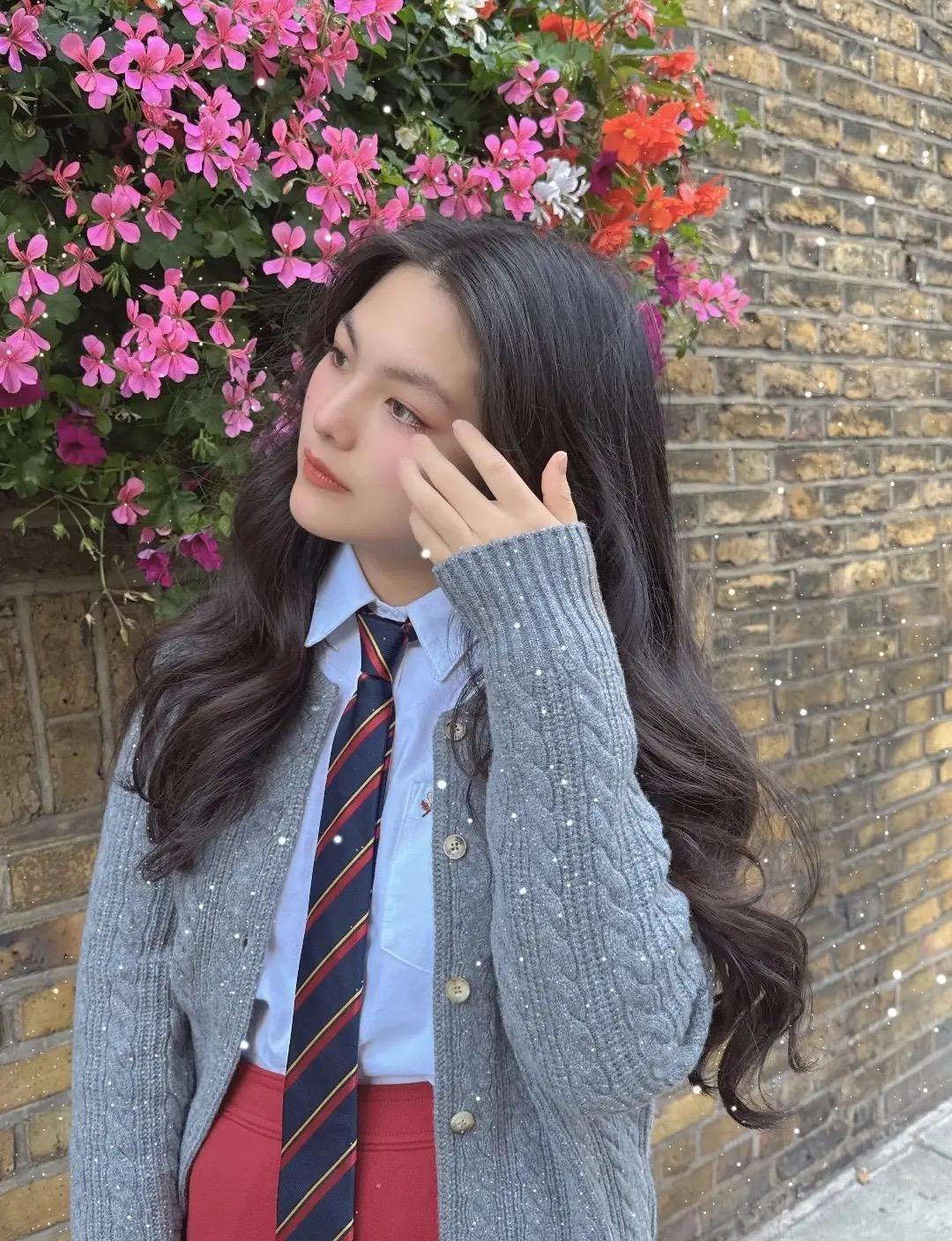 絞花針織開衫、白色襯衫,配了領結、紅色半身裙,既有青春的洋溢、又不缺少時尚感。主要是王詩齡身型太寬了,然後波浪卷也有點顯得太成熟。