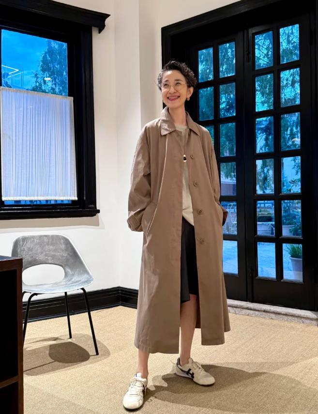 卡其色風衣真的是入秋的首選啊,這種款式基本是不挑年齡的,所以即便是50+的女人也照樣可以穿,優雅與休閒的融合,真的是別具一格,卡其色的長風衣,版型挺括又不失寬鬆感,輕鬆營造出隨性自在感,內搭淺色上衣,與深色下裝形成了對比,很顯層次感的組合,腳上配的白色休閒鞋,更是讓整個穿搭多了幾分休閒舒適。