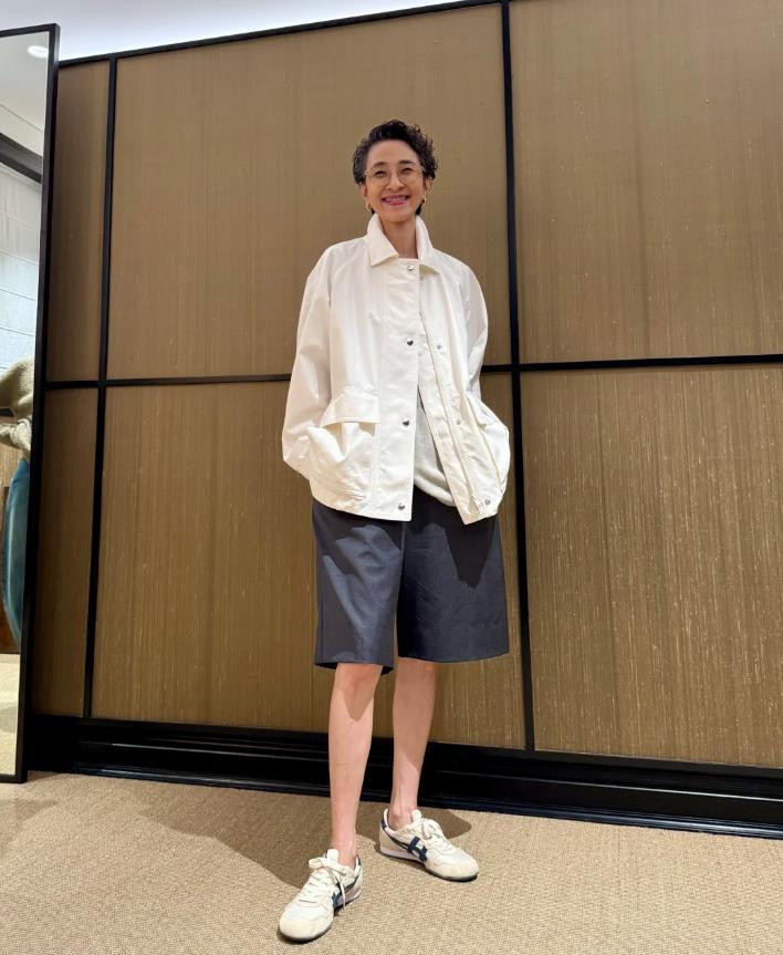 米白色的短款外套,版型寬鬆又不失休閒感,內搭淺色系上衣,與外套進行了呼應,下身選擇深灰色中褲,整個穿搭寬鬆舒適自在,露出來的腿部線條,讓整個着裝看起來多了幾分輕盈感,而白色休閒運動鞋的加入,則顯得更休閒活力,很適合日常出行,或是度假的裝扮,展現出輕鬆自在的氛圍感。