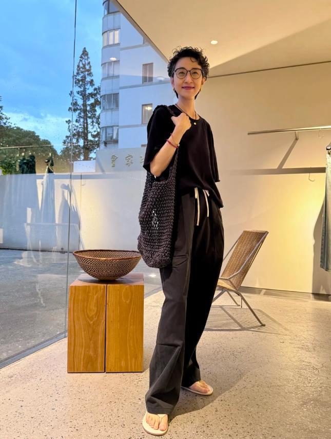 同色系的搭配,可是很省心的,對於50+的女性而言也是比較合適的,這套搭配整體以黑色爲主,簡約又不失質感,寬鬆的黑色短袖t恤,搭配深灰色抽繩闊腿褲,很是休閒隨性的打扮,利用深灰色編織包來增添自然氣息,與整體風格很相襯,出街的時候,再隨便穿上一雙拖鞋,輕鬆的日常感就打造了。
