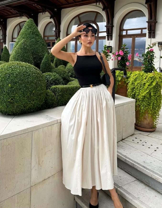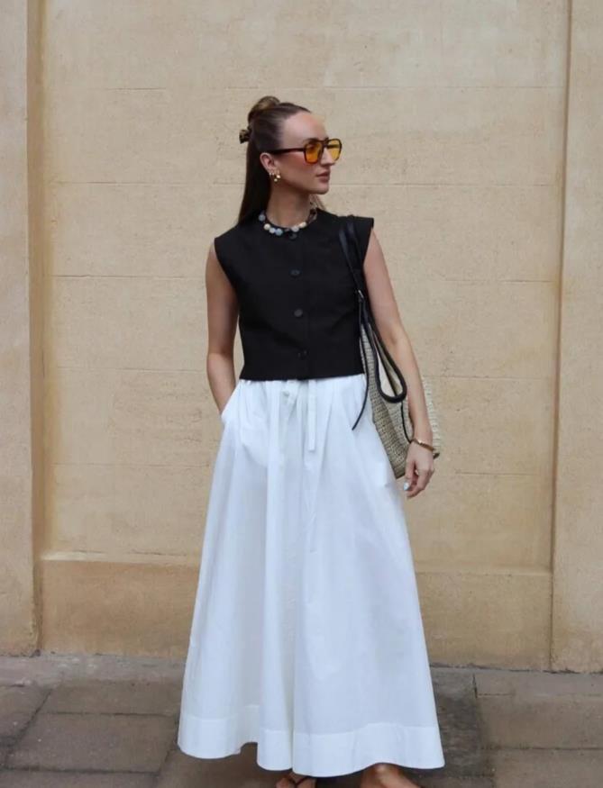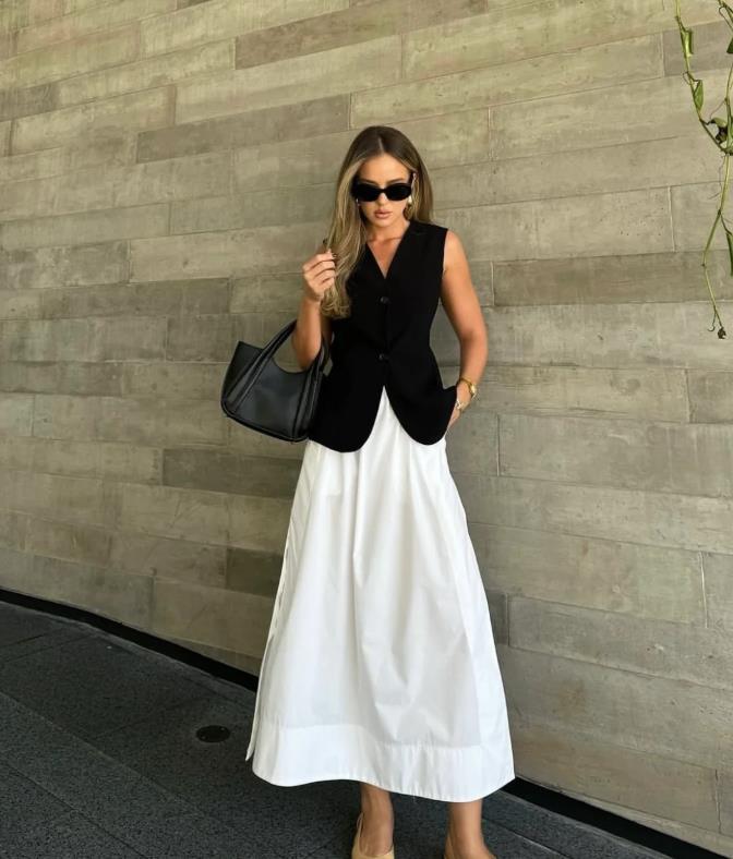 黑白的搭配,就是最時髦耐看的,黑色無袖西裝馬甲,穿上身顯得幹練利落,選擇與白色a字大擺半身長裙相配,有種剛柔並濟的調調,另外,黑色手提包和墨鏡增添了酷感,腳下的裸色高跟鞋,更是將穿搭的精緻感提升了幾個度,不管是職場通勤,還是逛街約會,都能輕鬆展現出優雅大氣。