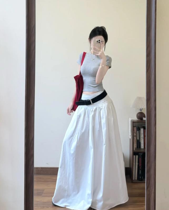 喜歡白裙的,又怎能不試試白色半身傘裙呢?灰色修身短款t恤,上身就勾勒出完美的身材比例,下面搭配白色大擺長裙,利用黑色寬腰帶巧妙分割了比例,挎着肩膀上的紅色包包,對整個穿搭進行了點亮,簡約中又不失個性,這樣一套搭配是休閒與浪漫的碰撞。