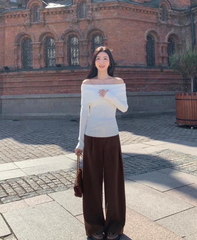 白色的一字肩上衣,穿起來也太溫柔氣質了吧,不過肩寬的女生就不太建議穿了,搭配咖色休閒闊腿褲,這種色調的褲子,還蠻有秋天的味道,寬鬆的版型+垂墜感極佳的面料,顯瘦且顯腿長,手裏拿着的包包,顏色也正好與褲子呼應,整體看着是那麼和諧養眼。