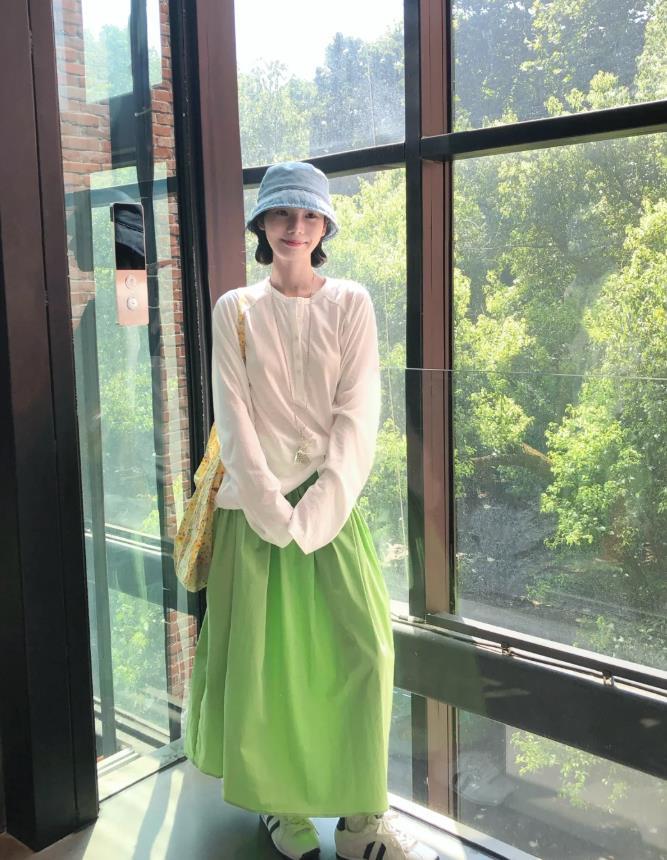 誰說綠色就一定是屬於春天的呢?即便是秋天也是可以穿的,現在早秋季節,這麼一套穿出街正合適,綠色的半身長裙,真的好美啊,寬鬆的版型,感覺穿得很舒適自在,也能遮掩身材的缺點,選擇一件白色的長袖t恤來配,有種淡人穿搭的既視感。