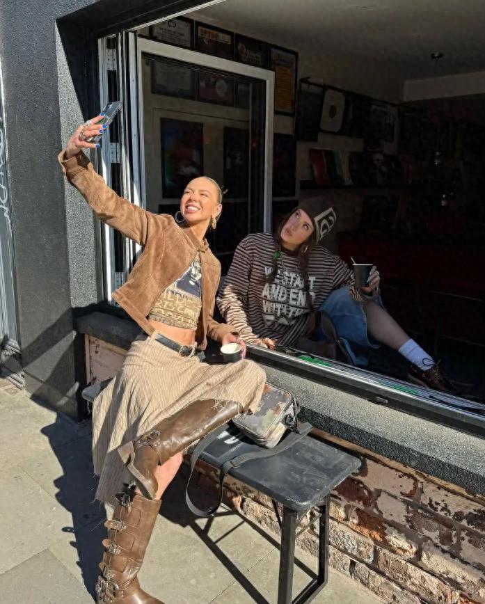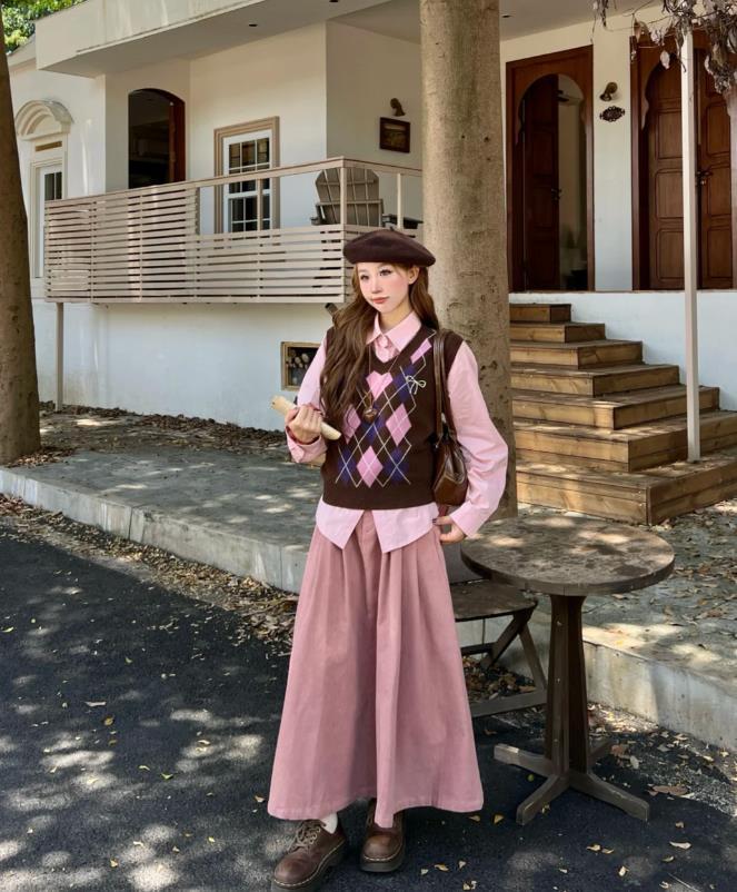 棕色大抵是很適合秋冬的一個色調了吧,但是像棕色、咖色這些深色系列,不適宜大面積使用,建議可以從包包、鞋子或者是一些腰帶來選擇,棕色+粉色撞色的毛衣馬甲,疊穿粉色襯衫,下身的半身長裙也是粉色的,與襯衫進行了呼應,不管是拍照,還是逛街約會,這樣的打扮都很上鏡。