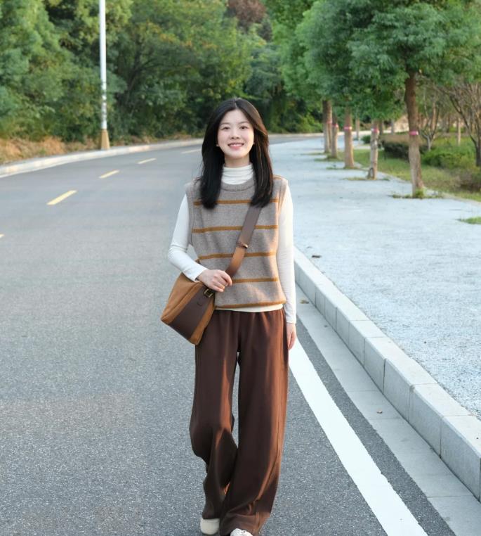 永遠都喜歡乾淨簡單的穿搭,這個秋天,你一定要利用起疊穿,比起單一的着裝,1+1的疊穿組合,更時髦好看。白色打底+條紋毛衣馬甲,再選擇一條棕色寬鬆闊腿褲,出門鞋子配一雙白色運動鞋就行,這樣的打扮,也太舒適自在了,關鍵是很顯瘦。