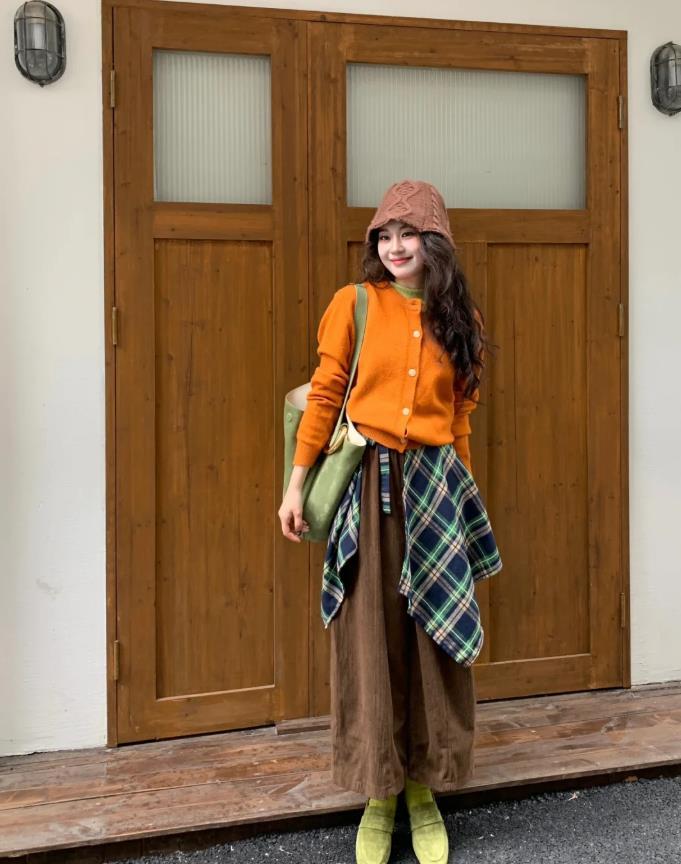 橘子味的秋天來啦,不要讓這個秋意漸濃的季節變得沉悶起來,所以你的穿搭就是需要加入一些亮色點綴,橘色的針織開衫,裏面疊穿一件芥末綠的打底,可太好看了,下身的搭配纔是整個穿搭的亮點,棕色的寬鬆闊腿褲,自帶濃濃的復古調,再利用一件格子衫圍在腰間進行修飾,怎麼看都是很有範的。