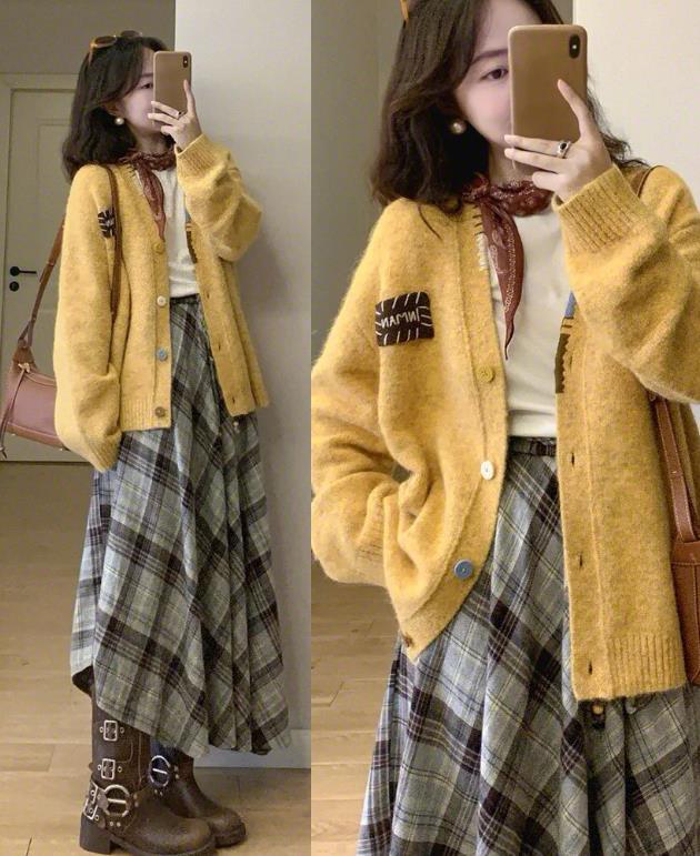 真的太喜歡明媚的色調了,特別是秋冬季節,穿搭總不能選得太沉悶的色調了,南瓜黃色的毛衣,有種被秋日暖陽包圍住的感覺,搭配彩色紐扣,這樣款式的毛衣開衫,一點也不會單調。下身搭配的波嬉風格紋裙纔是整個穿搭的亮點,混搭一雙酷酷的短靴,又帥又溫柔的。