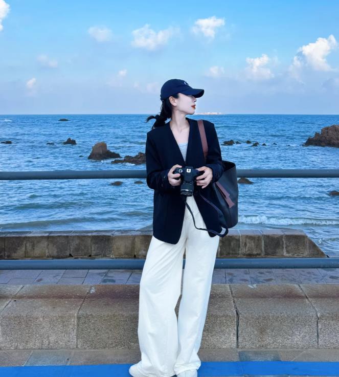 誰說黑色西裝就會穿得過於正式和嚴謹呢?只要你搭配休閒一些的裙子或褲子來穿,就會弱化屬於西裝自身那種幹練感。就比如配白色闊腿褲與休閒運動鞋,這樣的穿搭簡約大方又舒適,無論是上班逛街還是出遊都非常合適。