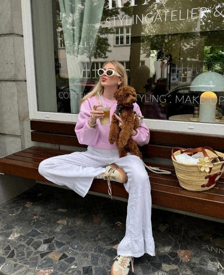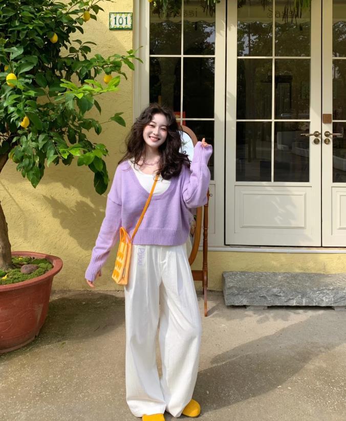 還有這種紫色調的針織衫,低飽和的配色,完全不用擔心會過分搶眼,或者是出現難駕馭的情況。裏面疊穿白色t恤或打底衫,增加層次感,又保證了穿衣溫度。下身配的白色闊腿褲,與內搭上衣進行了呼應,利用黃色的鞋子和包包進行碰撞,不管是在什麼場合都很出衆。