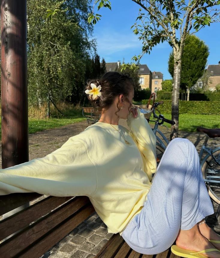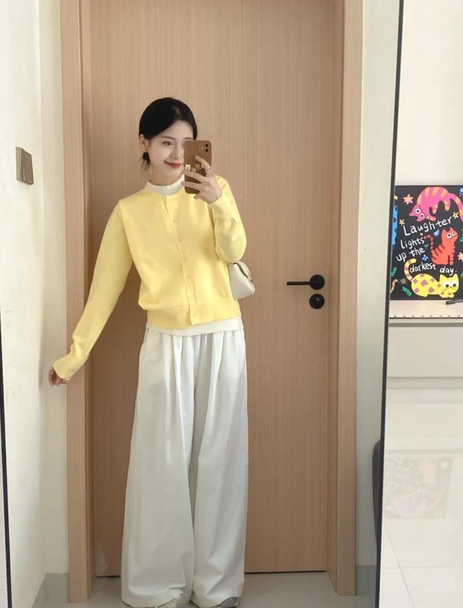 讓人眼前一亮的配色,看着也太好看了吧,奶黃色的針織小開衫,今年秋天似乎很流行這種款式呢,比起長款,這種小短款的款更適合個矮的女生,內搭白色打底,再配一條白色闊腿褲,不得不誇一句,真的太讚了,顯高挑更顯瘦。