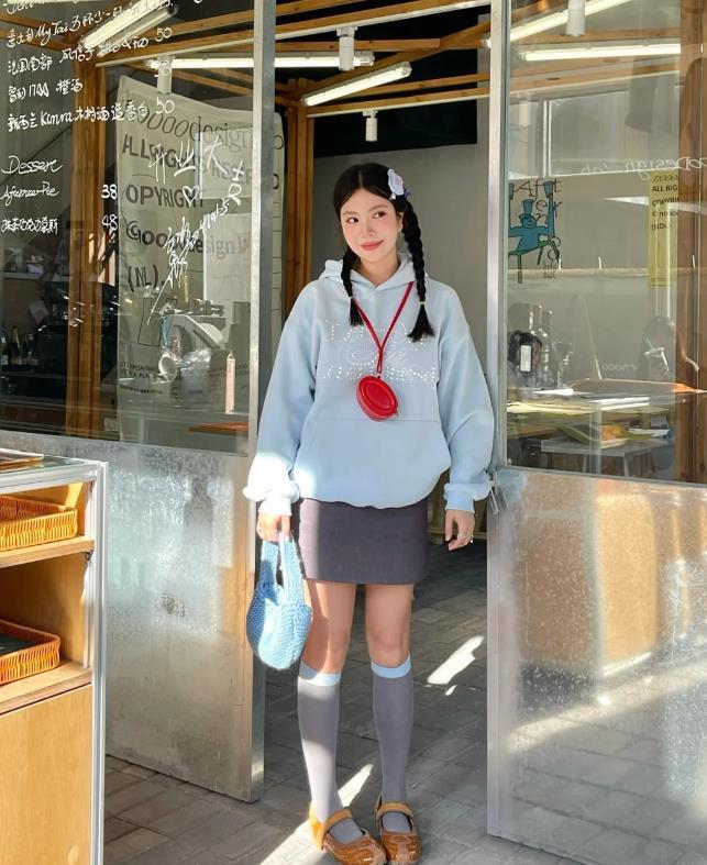 微胖女生、小個子女生都可以參考的一套秋天穿搭,喜歡這種淺藍色調的衛衣,穿起來就把膚色襯托得很白皙了,連帽的設計,增添了休閒氣息,搭配灰色半身短裙,藍灰的組合,就是耐看時髦,還好看,搭配棕色的瑪麗珍鞋和灰藍撞色中筒襪,穿搭細節便提升了。