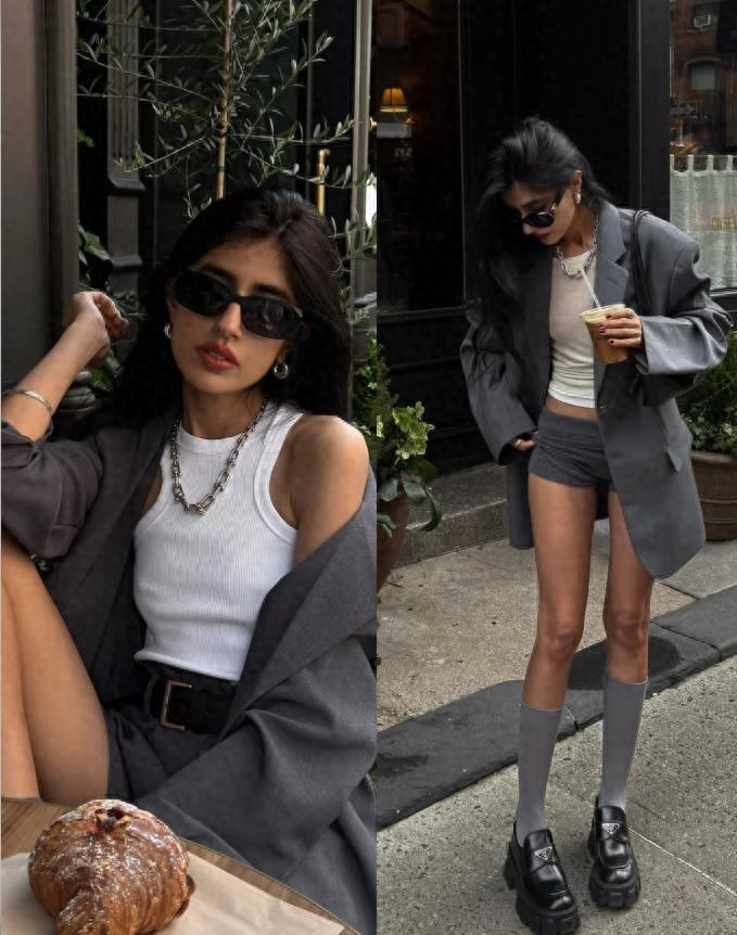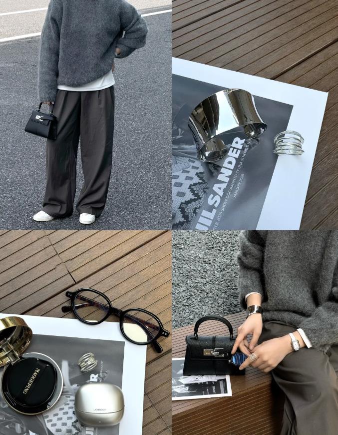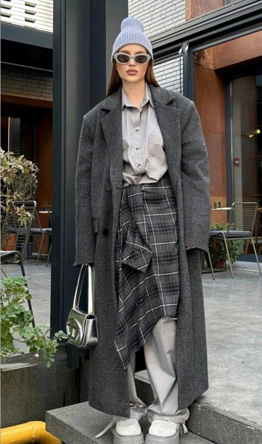 灰色是真的有種毫不費力的高級感,這一套深深淺淺的灰色穿搭,稍微與小面積的藍色碰撞一起,既不會太高調也沒有很張揚。反而是有種知識分子風的時髦感,格雷系女孩的既視感。