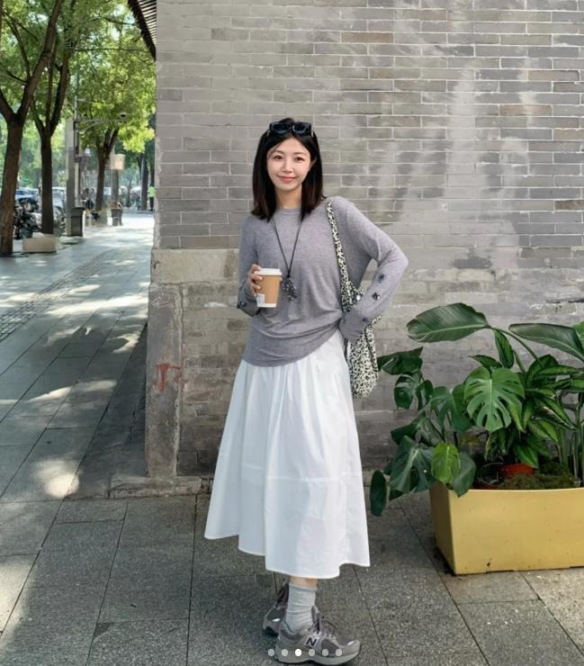都是很基礎款的單品,長袖t恤+白色半身長裙,整體配色是由乾淨的白色+高級的灰色搭配一起,白配灰就是yyds~喜歡這種帶點鬆弛感的穿搭,可太舒服有範了,裙子的長度剛好遮掩住小腿粗的缺點,藏肉又不會壓低個子,利用一雙灰色的運動鞋與上衣進行呼應,提升了造型的和諧度。