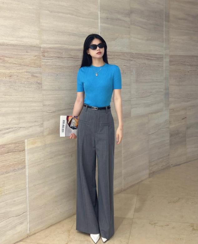 夏末初秋,這一套穿搭正好合適,灰藍的撞色,就是太出衆了,霧霾藍針織短袖,下身配的是灰色闊腿西裝褲,加上白色尖頭鞋的碰撞,一身穿搭的色調很極簡,上班族的女性們這麼穿,輕鬆拿捏時髦感。