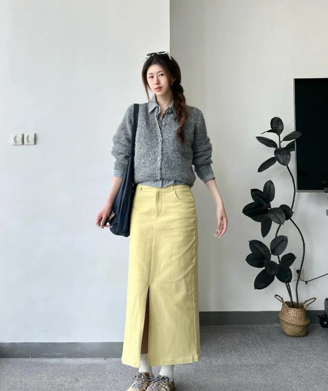 初秋上班的時候這樣穿吧,整體乾淨利落也非常時髦,短款的灰色針織衫搭配奶黃色半身長裙,輕鬆拿捏住時髦,完全沒有想到黃色與灰色的組合灰這麼和諧,反正整體給人一種很清新亮眼的配色。