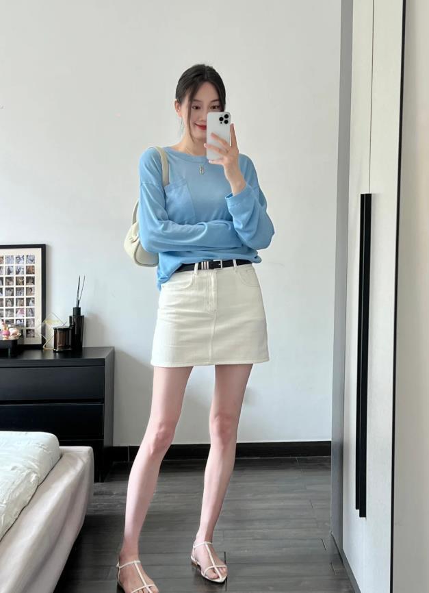 趁着夏天還沒有過去,好好過足一把短裙的癮吧,白色牛仔半身短裙,腿部比例線條好的,或者是小個子女生,就大方穿起來吧,利用腰帶進行裝飾,提高腰線又顯腿長,選擇一件藍色薄長袖罩衫,藍白cp讓人看起來就很清爽乾淨。