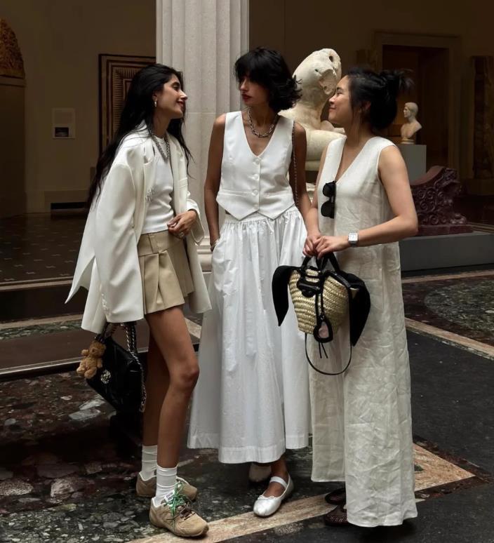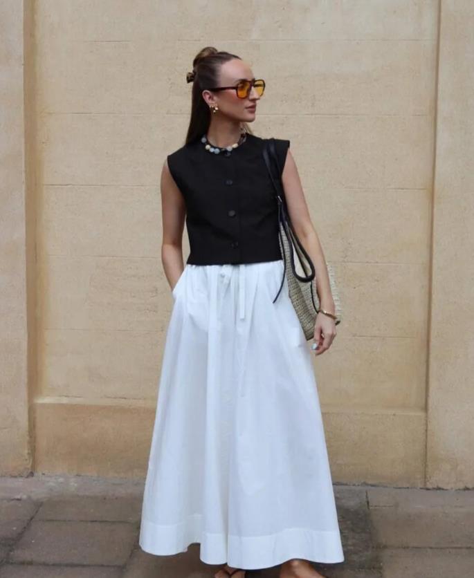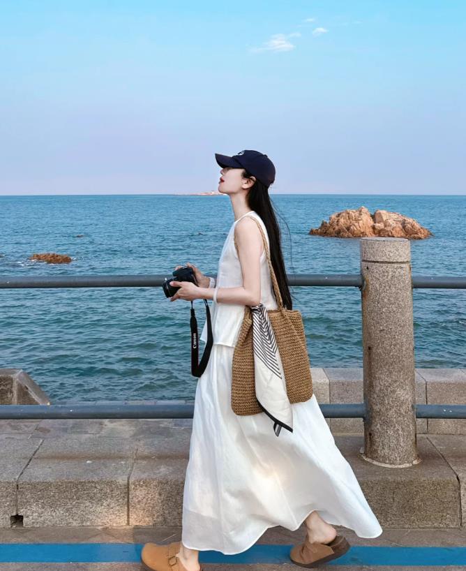 如果不知道穿白色半裙要怎麼配好看,可以直接選套裝來穿,這樣就可以省去了搭配的煩惱,白色無袖衫+白色半身長裙,簡潔大方又顯氣質,出門隨便配上一雙半拖鞋,或者是運動鞋就可以,逛街、約會或者是上班都合適。