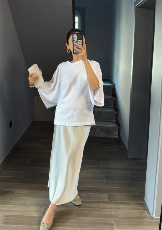 今年這種緞面裙也是非常流行的,質感可是超棒的,柔軟舒適,最重要的是這種裙子材質垂墜感很好,搭配寬鬆的版型,感覺什麼身材都能穿,上衣哪怕配這種基礎款的白色休閒t恤也沒有違和感,鬆弛感的穿搭直接拿捏住了。