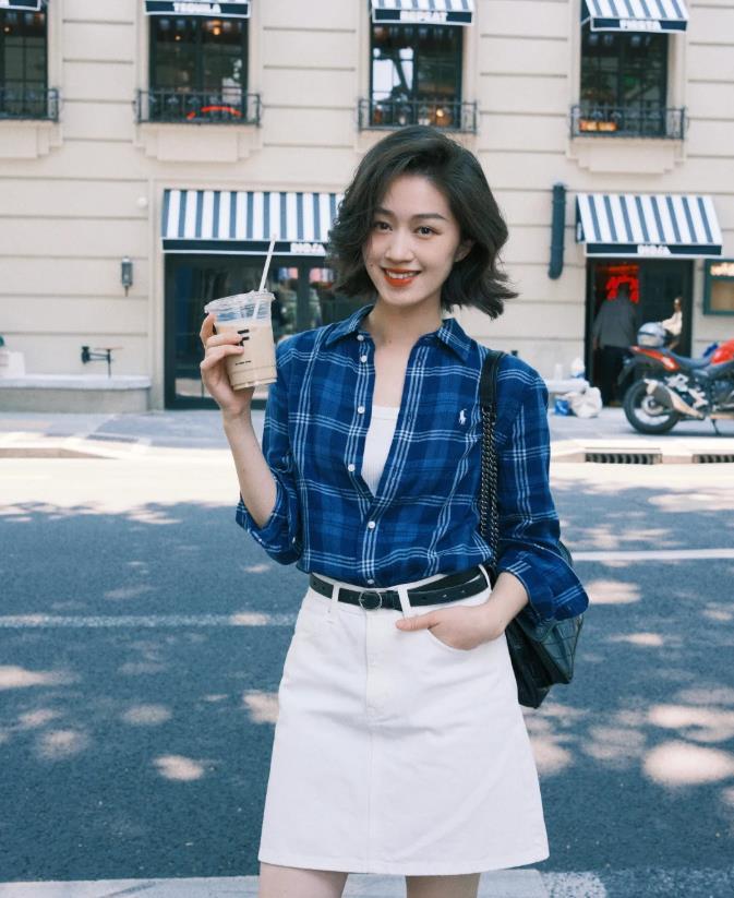 沒有襯衫的早秋怎算完整呢?這一套適合夏末初秋的搭配,簡約舒適又休閒,不管是出門逛街,還是上班都可以滿足。藍白配色格紋襯衫,帶點一丟丟的復古味道,與白色牛仔半裙相呼應,整個穿搭遵循了簡繁組合,時尚又好看。
