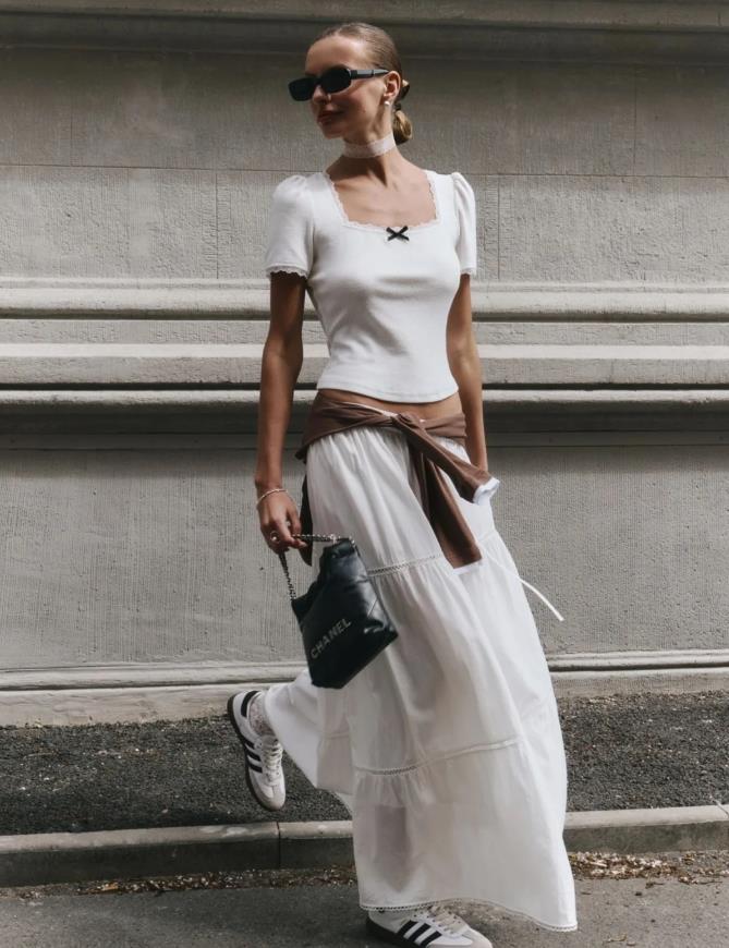 今年早秋穿裙子,還是長一點更好看,像這種白色半身長裙,穿上身就有種飄飄然的既視感,蕾絲的材質,帶着幾分小性感,至於搭配上,選擇黑色上衣就可以,畢竟,黑白配是永遠不會出錯的組合。