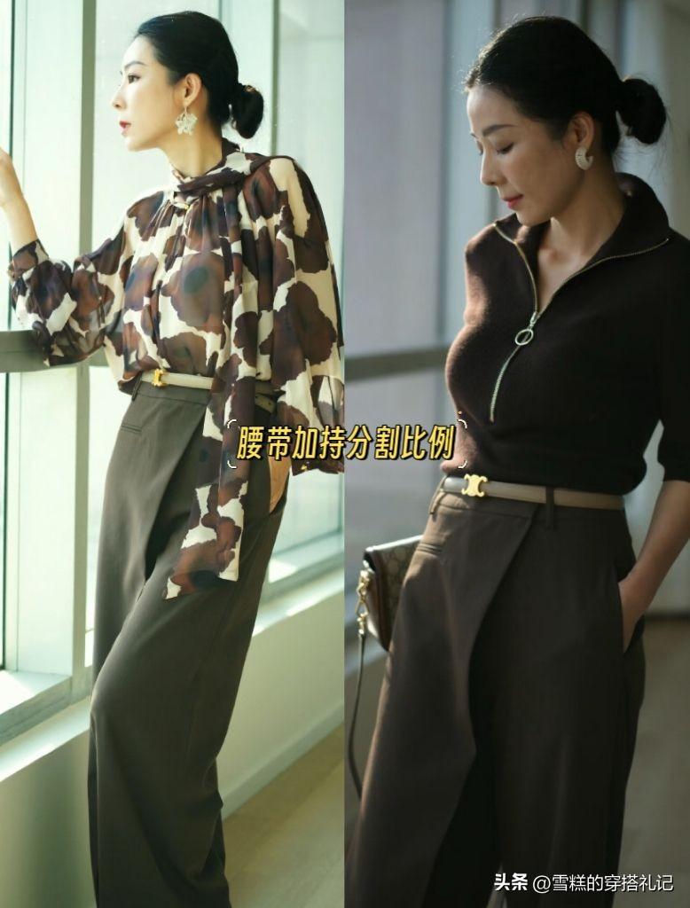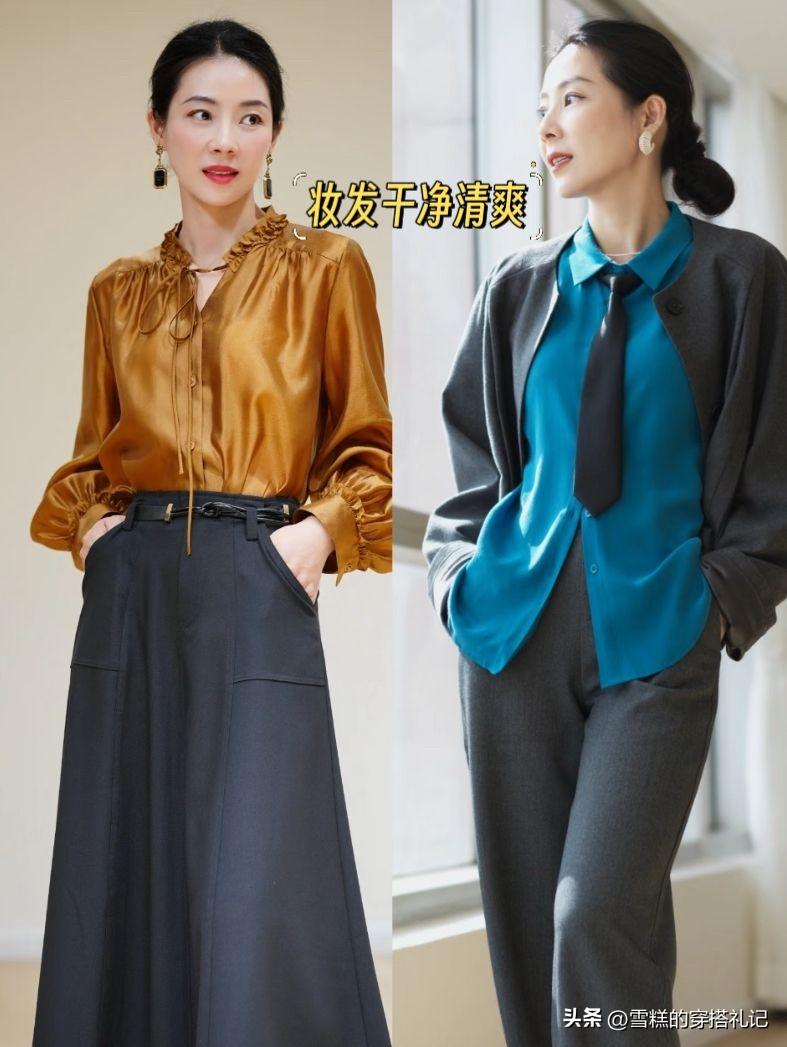跟小香風單品比起來,更建議中年女人穿“無齡感單品”,例如襯衫、針織衫、闊腿褲、A字裙,無論怎麼組合都不會出錯,但前提是要明示腰線。