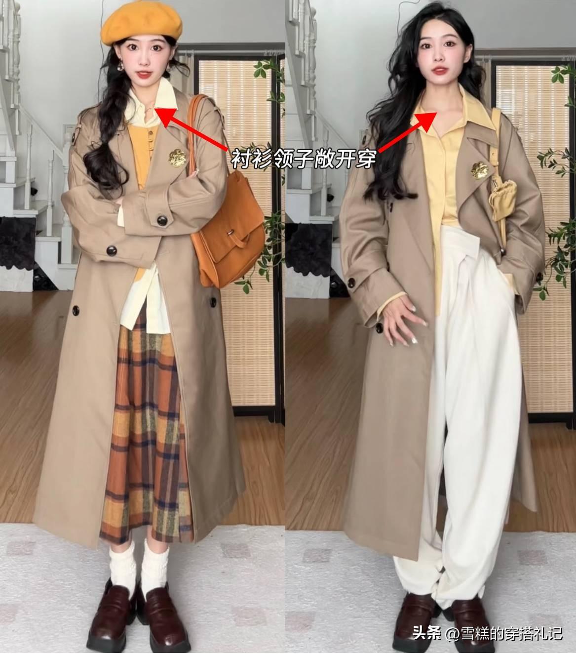 3.卡其色風衣疊穿襯衫,領子解開穿更隨性