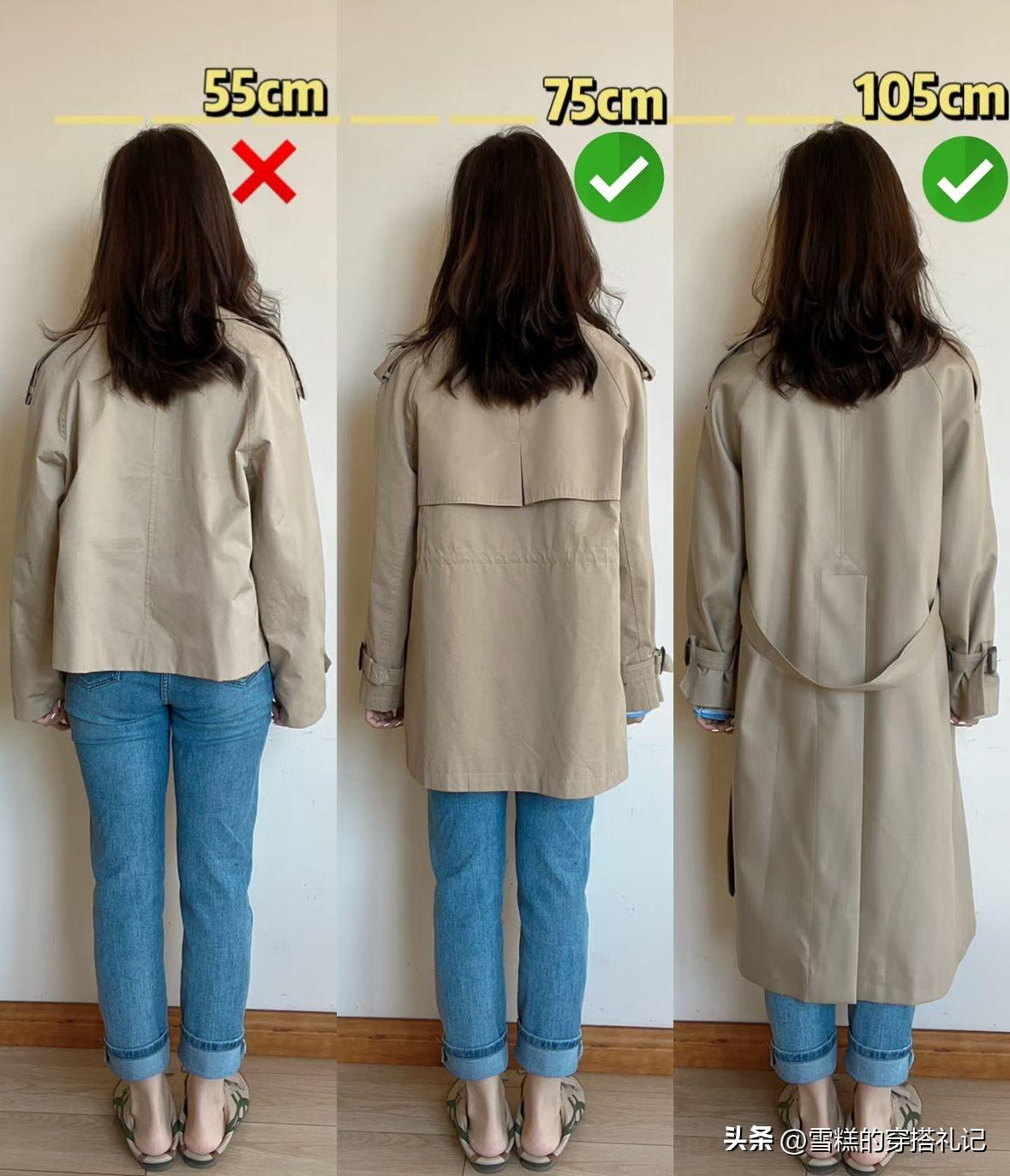 風衣想要穿的好看,首先要選對合適的長度,就算你的身材再好,也不推薦穿55釐米的短風衣,建議可以選擇75cm~105cm的中長款風衣或者長風衣,適配度更高。
