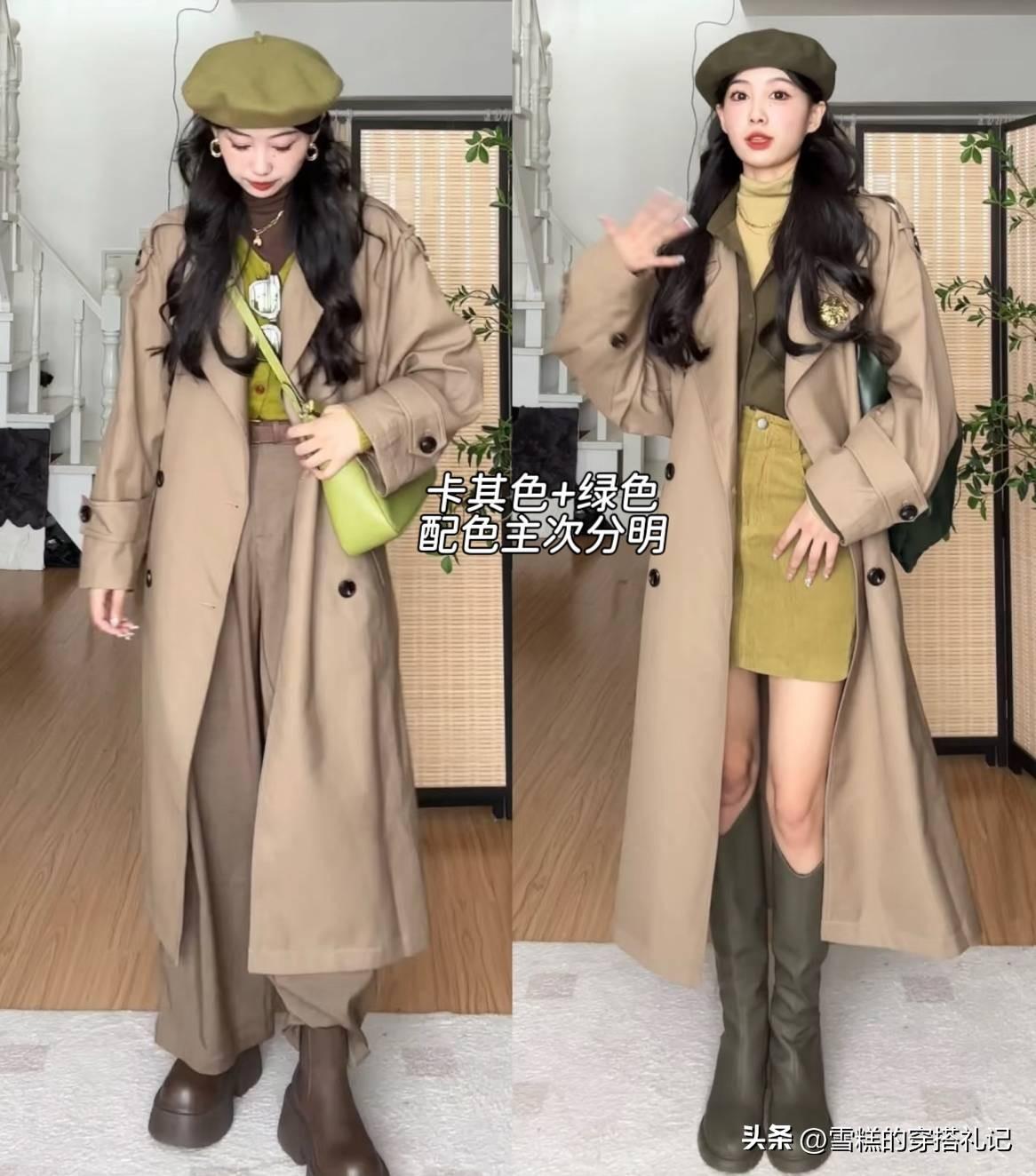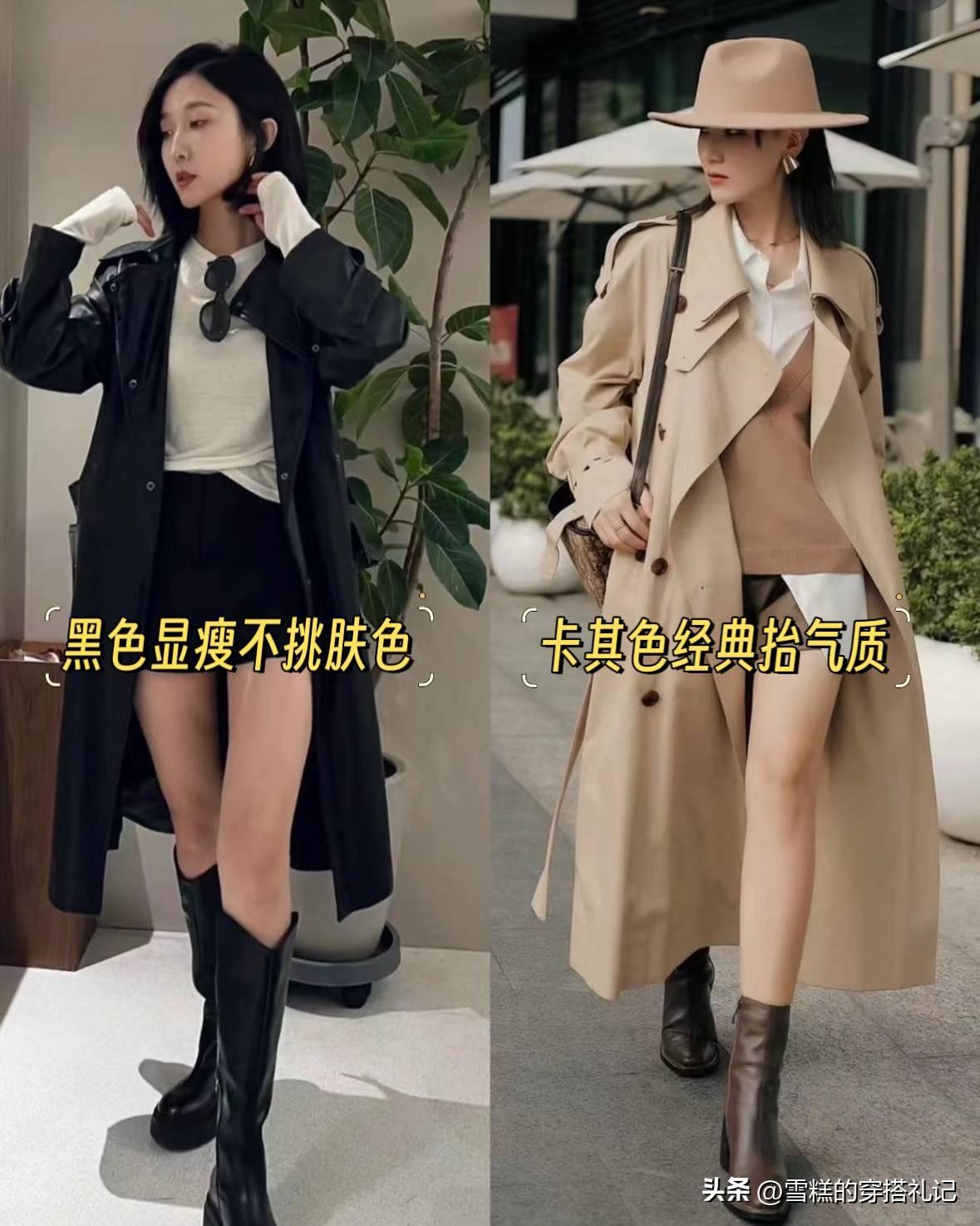 最經典的卡其色風衣,既能凸顯出質感,特別顯氣色,白皮推薦選擇淺卡其色,黃黑皮推薦選擇灰調卡其色,或者可以嘗試一下百搭又顯瘦的黑色風衣,不挑剔膚色,而且還具備很高的適配度。