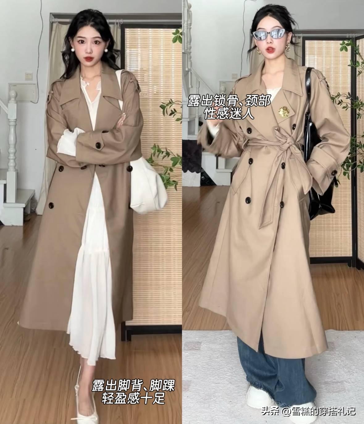 繫帶風衣敞開穿、裹上穿都好看,敞開穿疊搭長裙,建議配雙淺口鞋,露出腳背、腳踝更顯高;長風衣裹上穿,配條闊腿褲,踩雙厚底鞋,氣場全開!