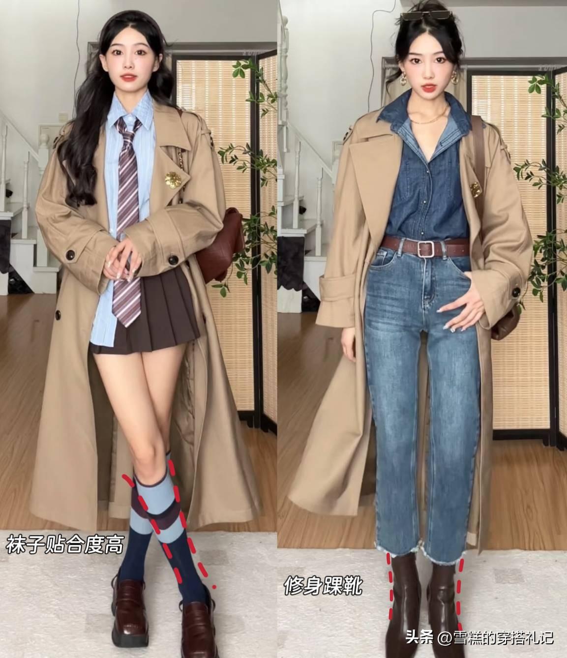 風衣比較寬鬆的時候,內搭可以選擇修身款,衣服都是屬於寬鬆版型,就可以用貼合度高的襪子、踝靴,形成對比感,在適當的露出頸部和大腿肌膚,呼吸感拉滿。