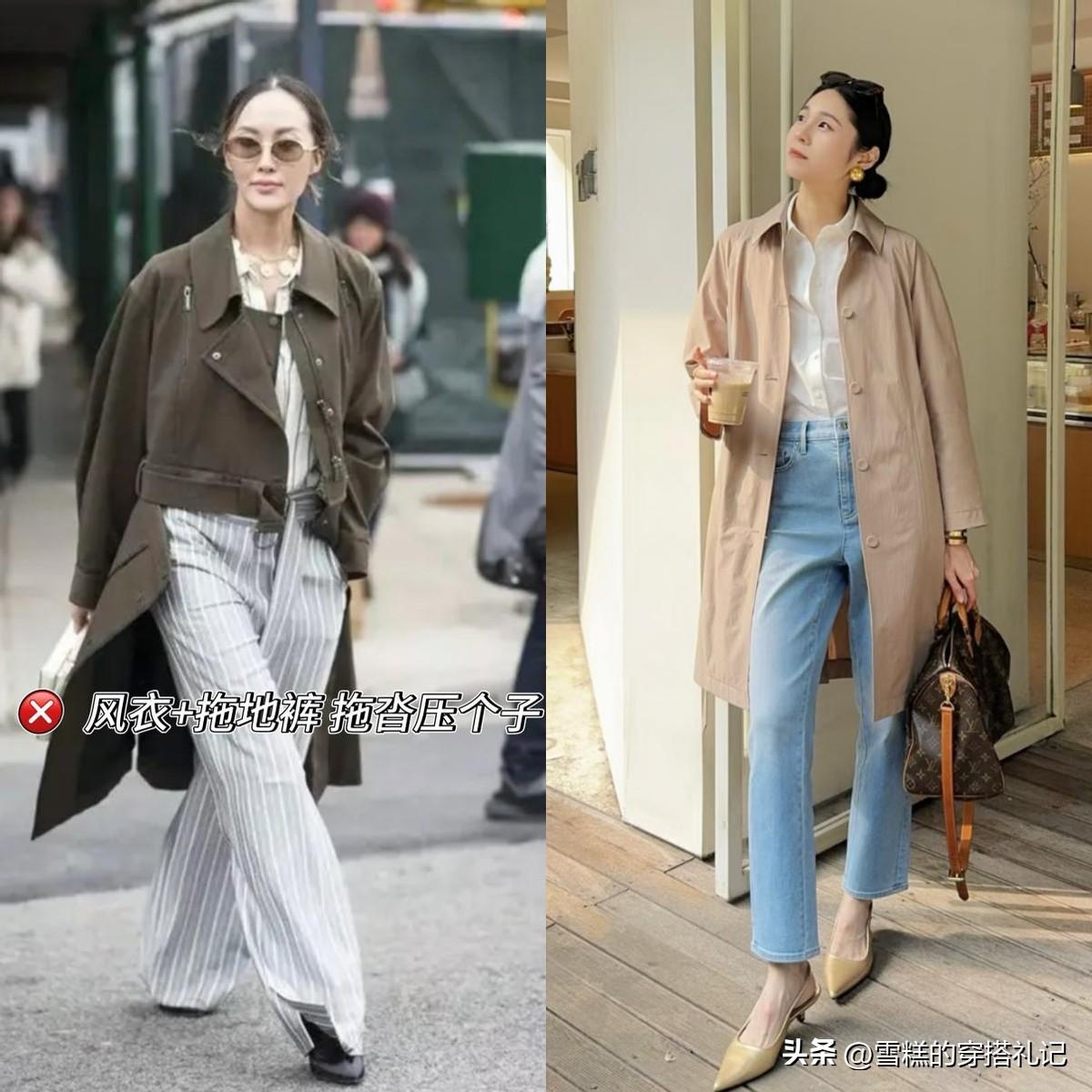 褲腿太長,不僅容易被踩到,甚至還會壓個子,就算是個子高挑的女人,穿風衣配拖地褲,也會有違和感,配高跟鞋也很難挽救回來,分分鐘拉低造型的檔次。