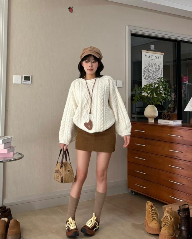 很適合早春、初秋的穿搭,白色麻花毛衣,細節感是很到位的,寬鬆的版型,穿起來給足了身材包容性,關鍵是舒適,有小肚腩的也基本沒有問題,下身搭配棕色的半裙,和棕色的運動鞋相呼應,整體的配色就和諧很多了,再利用一雙中筒襪點綴,豐富了整個穿搭。