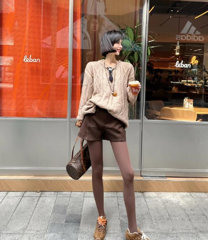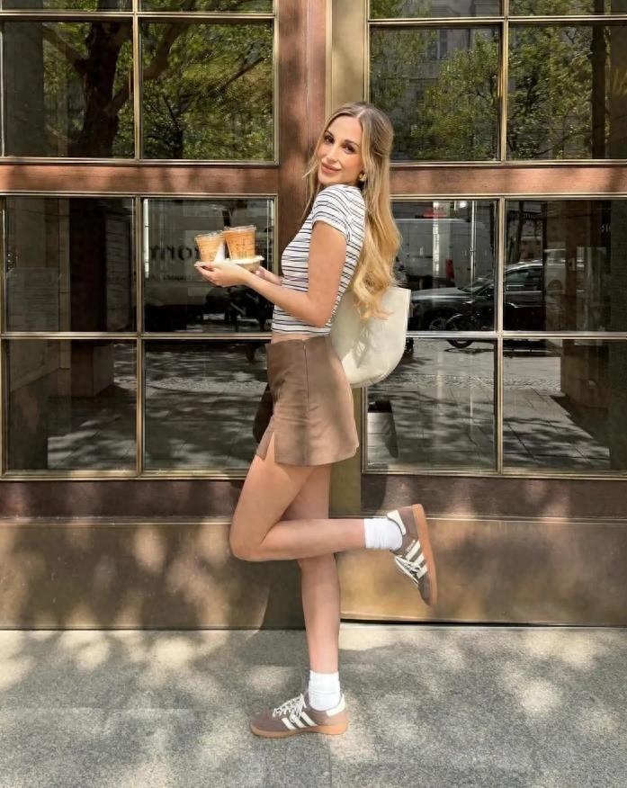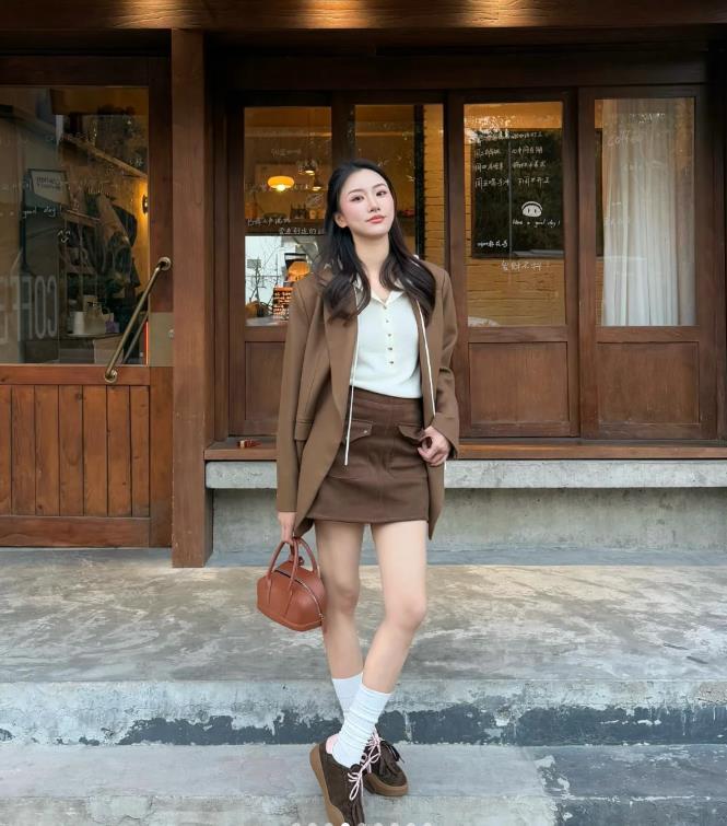 真的被這一身棕色系穿搭硬控住了,棕色西裝外套搭配同色的半身裙,上衣內搭選擇了一件白色針織衫,這樣的配色實在是太搭了,腳上穿得棕色運動鞋也與裙子、外套進行了呼應,白色的襪子增添了造型層次感,小個子女生直接照搬就行。