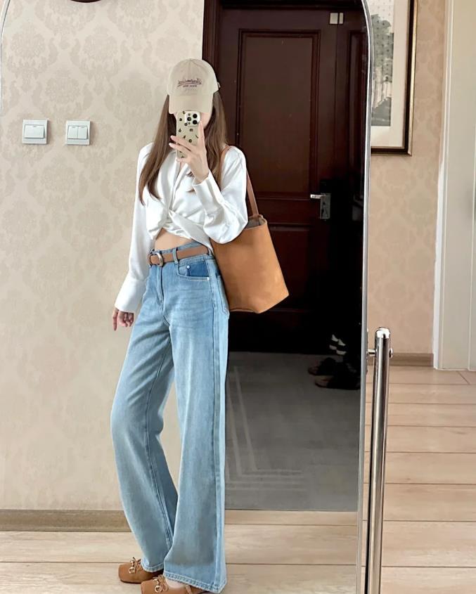 早秋,選擇一雙棕色的芭蕾鞋來穿穿吧,搭配起白襯衣和牛仔褲,這樣的組合,可真的是經久不衰啊,直筒版型的褲子,既能修飾腿部線條,還可以在視覺上拉長腿部線條,況且整體的配色是很耐看的,白色+藍色+棕色,腰帶和包包與鞋子顏色一致,提升了造型和諧度和時髦感。