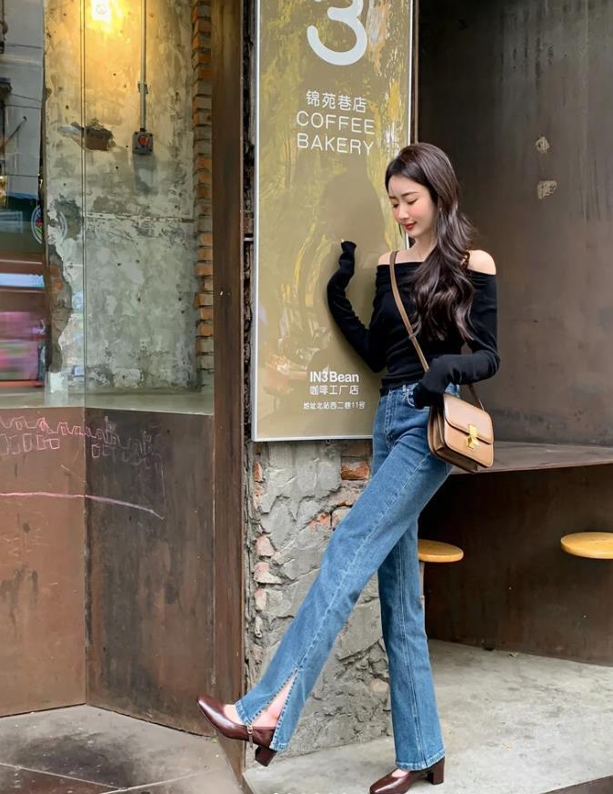 棕色的瑪麗珍鞋與牛仔褲是很搭的呢,整體的風格偏向一種文藝復古感,褲子的褲口處進行了小開衩設計,隱約間就能把雙腿的比例拉長,搭配一字領黑色上衣,充滿了小性感又不失氣質,初秋穿這樣一套出門逛街、上班都是很不錯的。