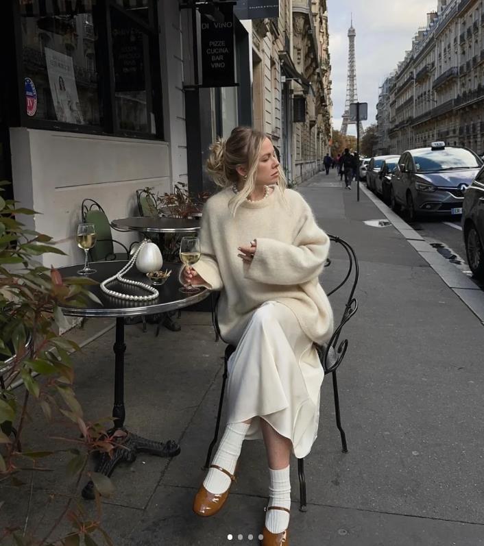 法式慵懶風最適合秋天了,看似隨意的裝扮,實則暗藏着時髦與精緻,雖然一身白,但面料的差異會呈現出不同的層次感,腳上搭配一雙棕色瑪麗珍鞋,與白色襪子結合得很合適,這樣的穿搭讓整個穿搭都呈現出輕盈感,記得要佩戴一些珍珠項鍊來點綴,從而提升造型精緻度。