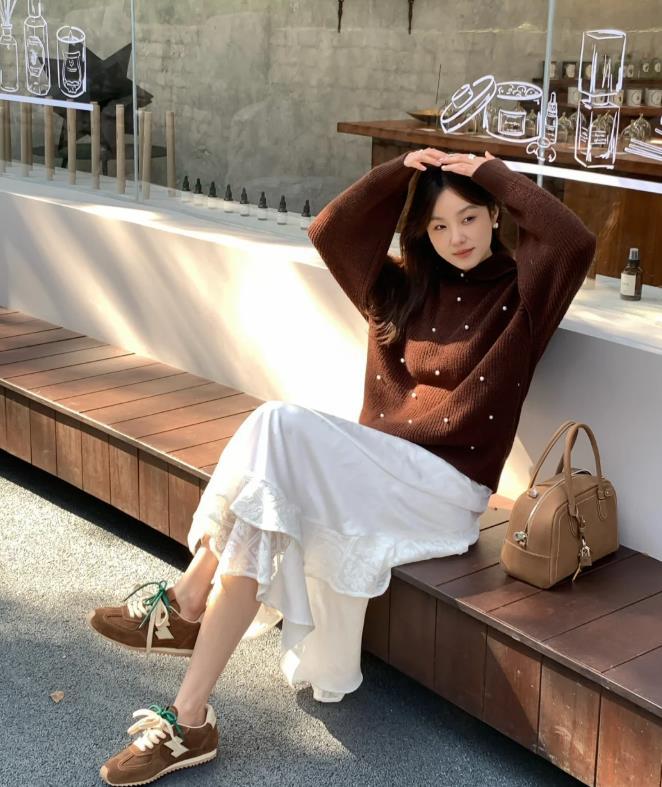 這完全就是一套美拉德風的搭配,棕色的珍珠毛衣,細節上可是很到位的,看似基礎的款式,實際上暗藏小細節,搭配白色半身長裙,又多了幾分仙氣感,很顯鬆弛與慵懶的調調,腳上選擇一雙棕色運動鞋,真的是非常舒適自在的。