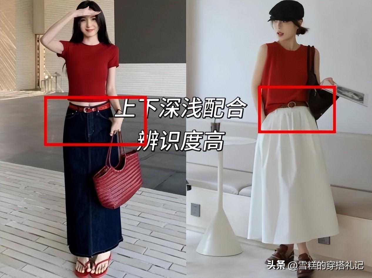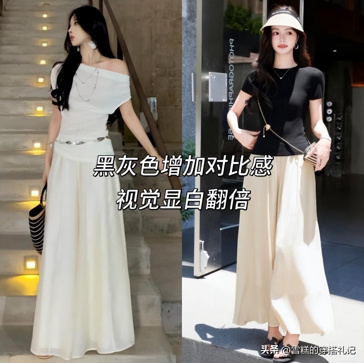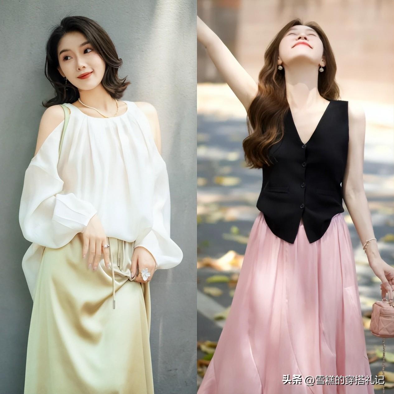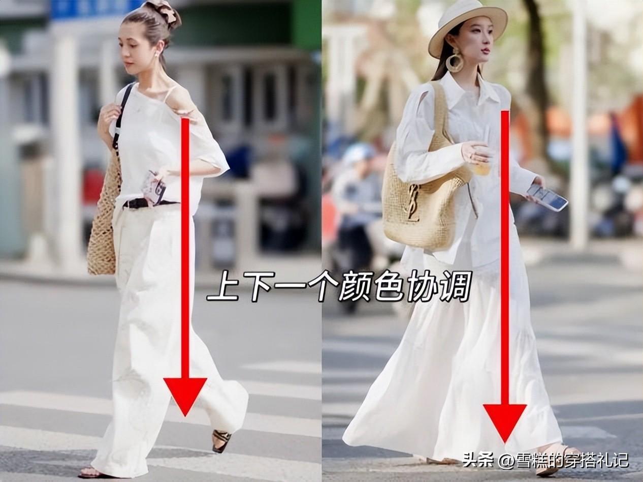 個子比較矮、身上贅肉多的姐妹,可以多試試深淺搭配或者冷暖搭配的對比配色,比如上半身可以穿這種奶白色、卡其色的襯衫、打底衫、短袖等等,下面配比上衣深一個色號的褲子、長裙,自然而然的拉伸了線條,讓你的雙腿看起來更加細長。