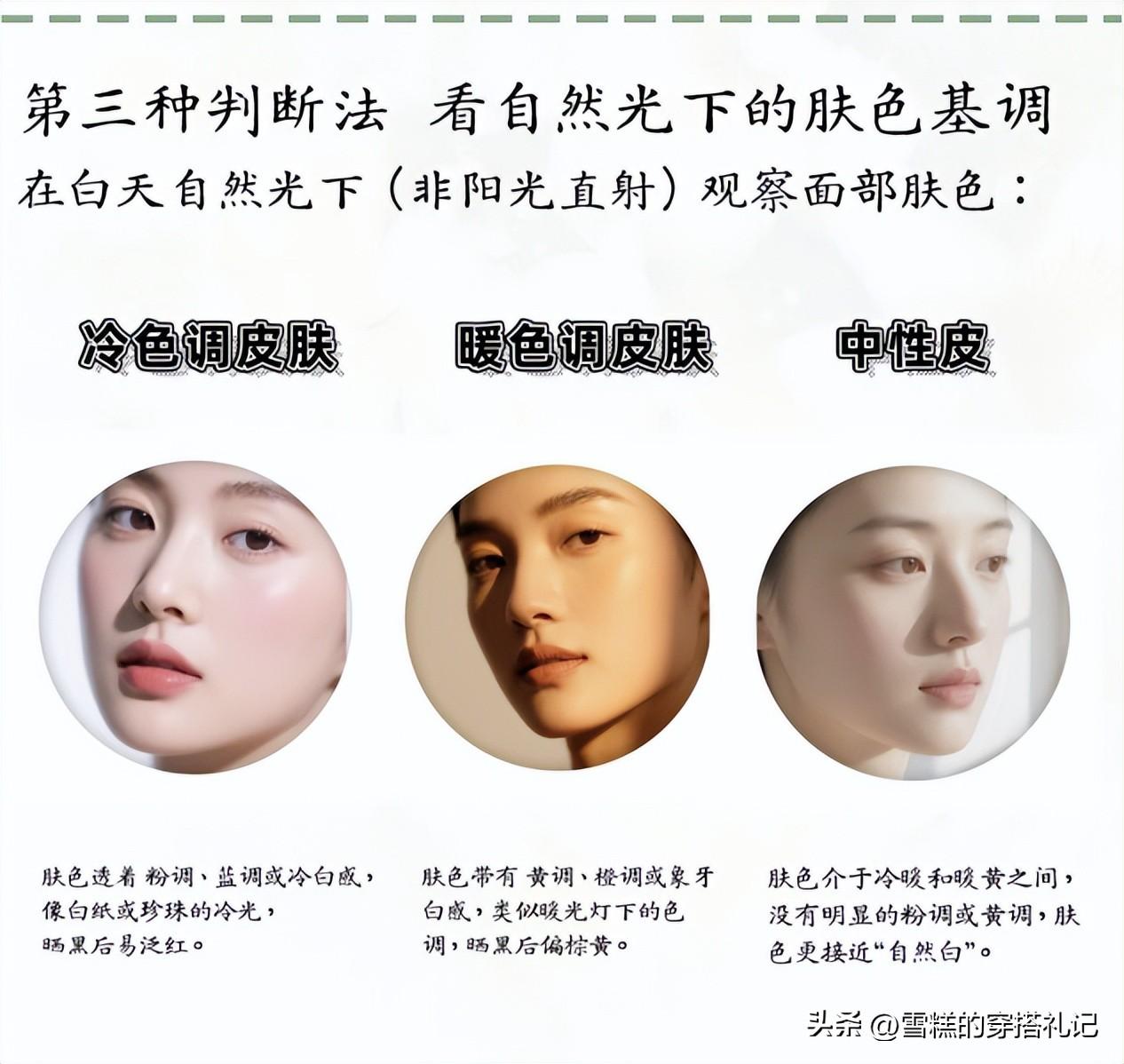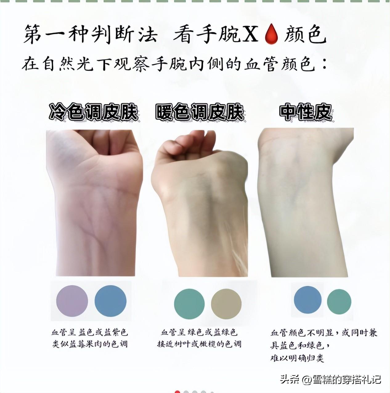 大家可以觀察下自己的手腕內側的血管顏色,如果大部分的血管呈現出藍色或者藍紫色,那麼你的膚色會更加偏冷色調一些,如果整體偏綠色,妥妥的暖黃皮。這種方法的比較直觀一些,但是有些人的血管顏色不是很明顯,只作爲借鑑會更好一些。