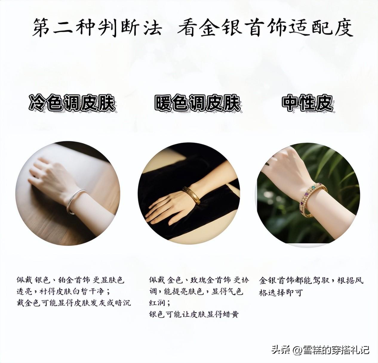 這種方法會更加直觀一些,在佩戴金色的首飾的時候,比如金屬耳圈、黃金項鍊、玫瑰金手鍊等等,要比佩戴純銀首飾的時候更加好看,膚色看起來更加通透,那麼你就是暖色調的膚色,反之就是冷色調,大家明確了自己的冷暖色調,可以降低將穿錯顏色的概率降低到80%.