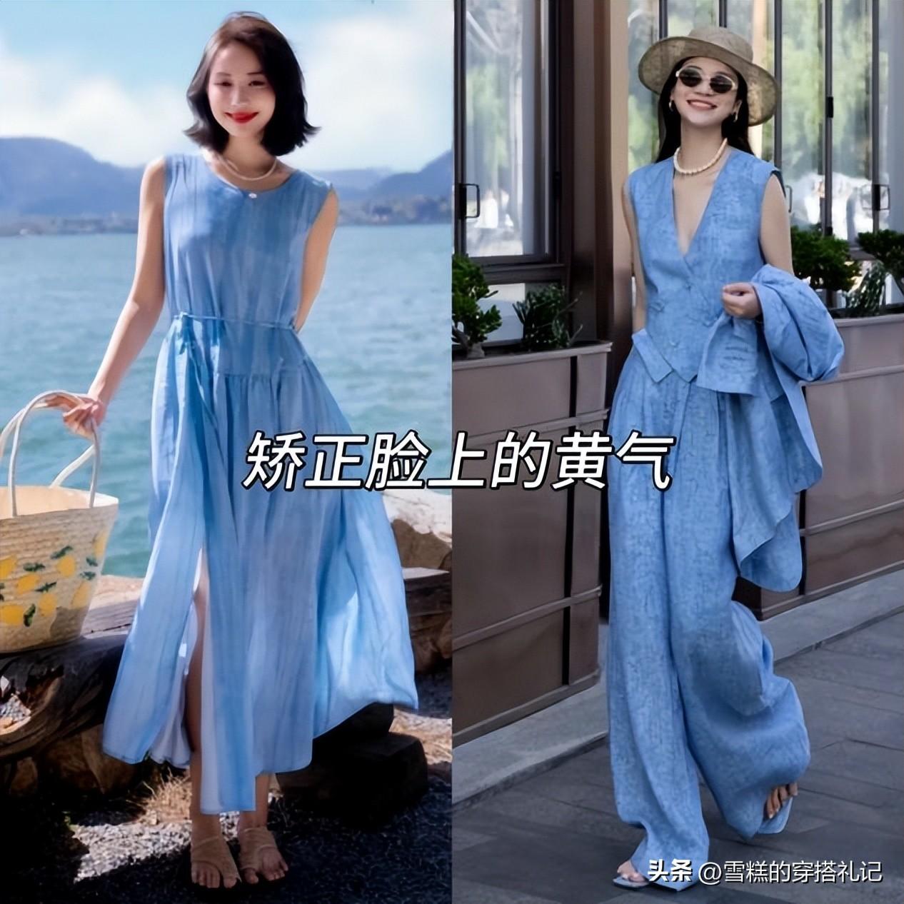 千萬別再說藍色顯黑了,其實選對天藍色,比穿白色還能襯得皮膚透亮!格舉個例子,黃黑皮+三十歲以上的女人,可以藉助天藍色和黃色這對互補色修正你的膚色問題,不像暖黃色、橘色那樣,一穿就跟皮膚黃氣疊一塊兒,顯得更暗沉。但是大家在選擇色調的時候,記得選擇不深不淺的天藍色,自帶清爽感,不會像深藍顯悶,也不會像淺藍沒存在感,襯得人氣質特乾淨。