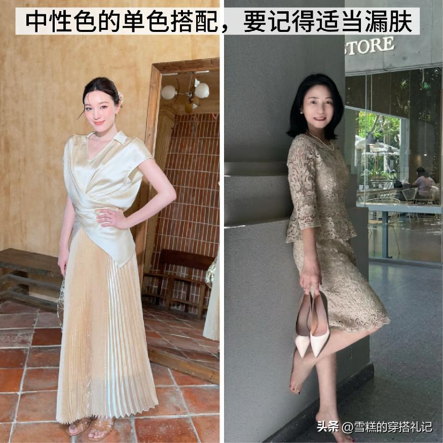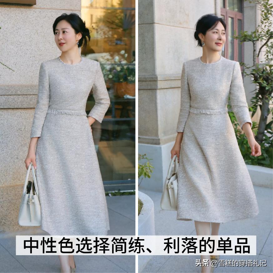中性色系列的單品搭配如果是長款的設計,其實會更加的適合在日常當中進行運用,尤其是對於上了年紀的女性來說,裙裝的搭配還是非常有必要運用膝蓋以下的設計長度的,不僅能夠遮擋住身材上的不足,最主要的是襯托出來的優雅以及得體的視覺魅力也會比較明顯,最主要的是中性色調的搭配,它本身就能夠將高級感的氣質給體現。