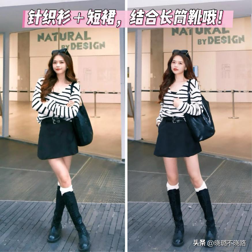 ❷ 露腿穿搭,很適合短裙+長靴,太時髦啦