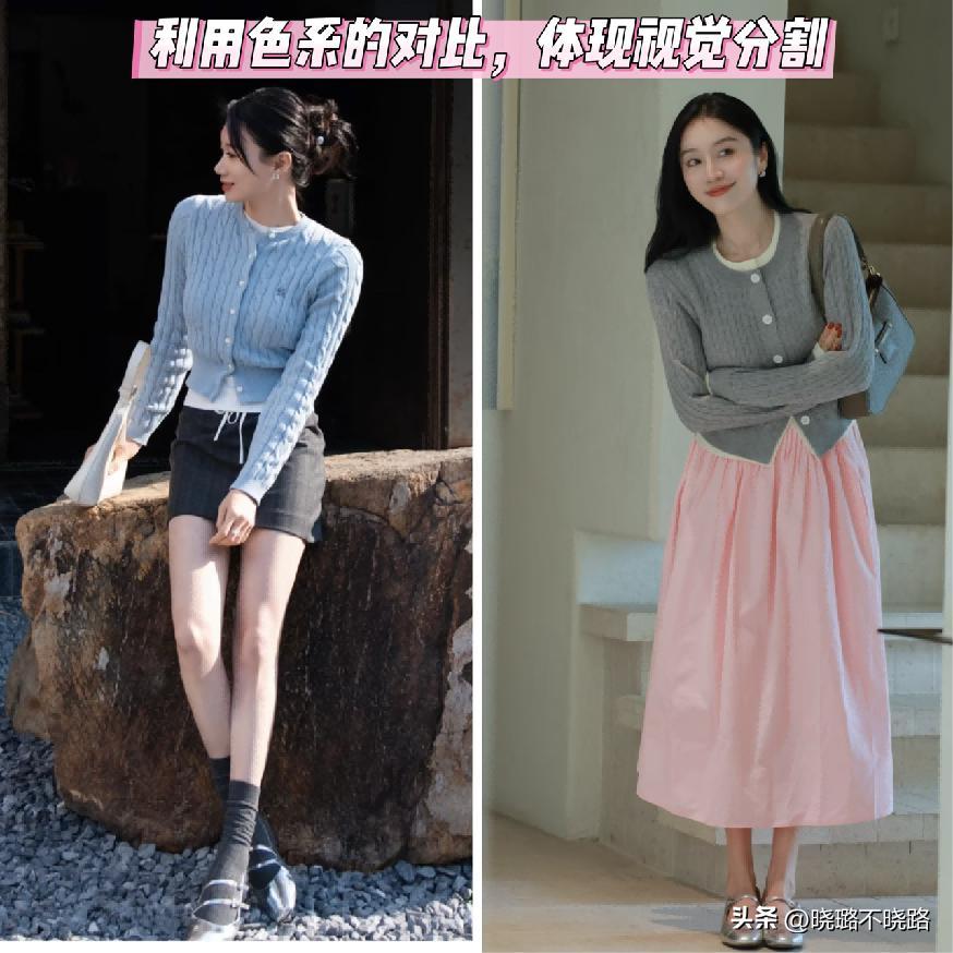如果你的個子不高或者是本身的比例狀態不好看的話,那麼其實像秋季當中的搭配開衫和長款的半身裙褲裝進行搭配組合整體出來的上短下長的比例就已經非常彰顯整體視覺上的比例優勢了。在這個時候你這兩款單品就可以組合運用對比的色系在整體視覺上的分割感是非常強烈的,非常適合各位小各自的女性進行運用。