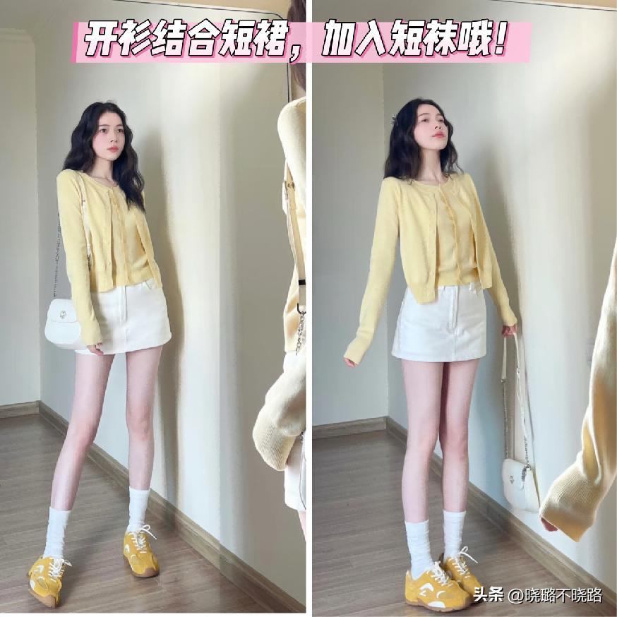 開衫我們也可以選擇結合短款的裙裝來進行搭配,整個視覺上的重點就是下半部分的縱向比例是能夠將其拉長的,因爲二分長或者三分長的短裙,它本身就能夠讓我們整個下半部分的腿型狀態襯托出標準又顯腿長的優質比例,在這個時候也能夠優選結合短襪和厚底鞋的元素,又顯腿長又顯得非常具有時髦和減齡的效果。
