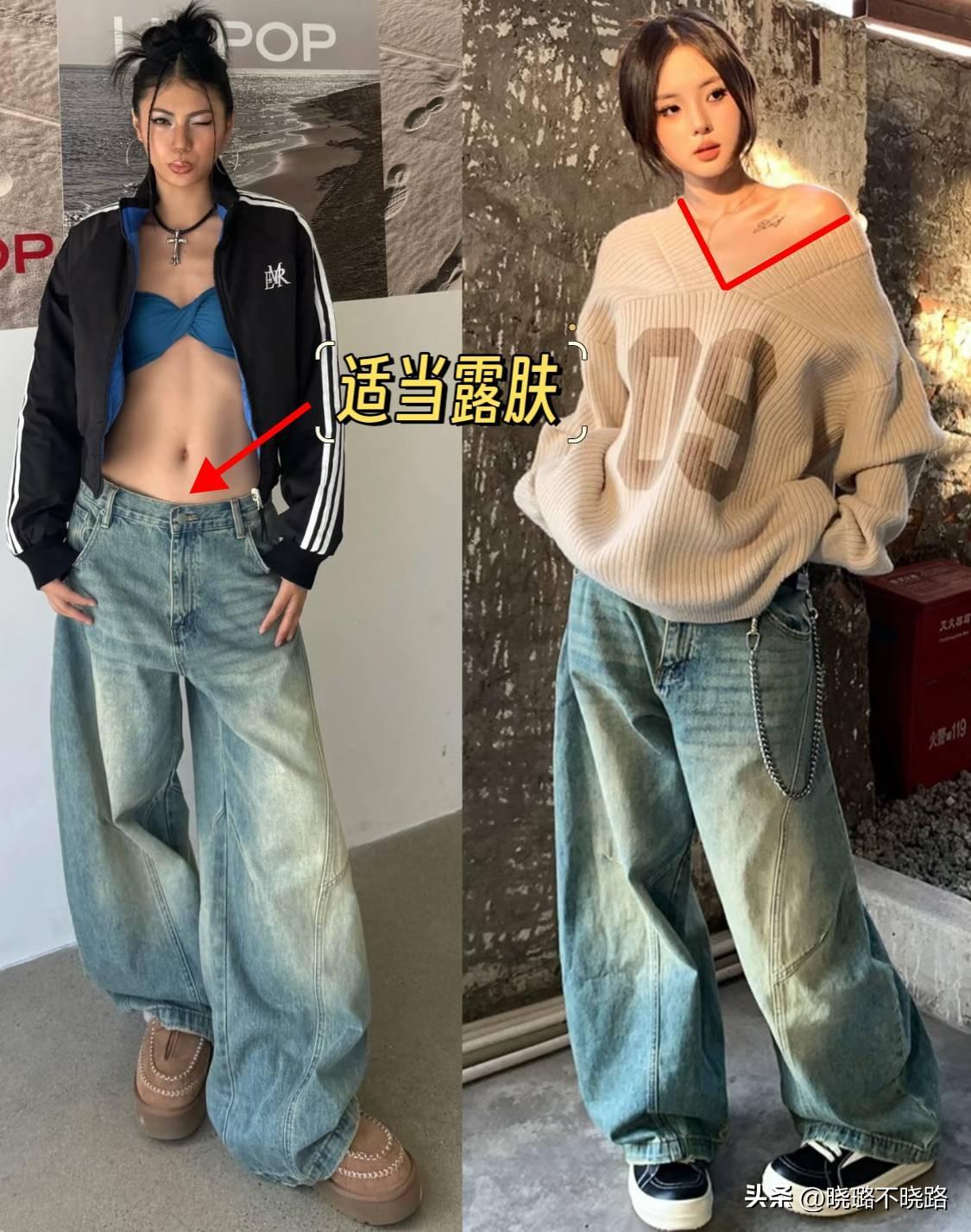 穿搭一定不能過於暴露,像彎刀褲這種長褲類型的單品,只要將“露膚感”集中在上半身,但上衣也要控制好露膚面積,千萬不要直接穿露臍抹胸或者吊帶。