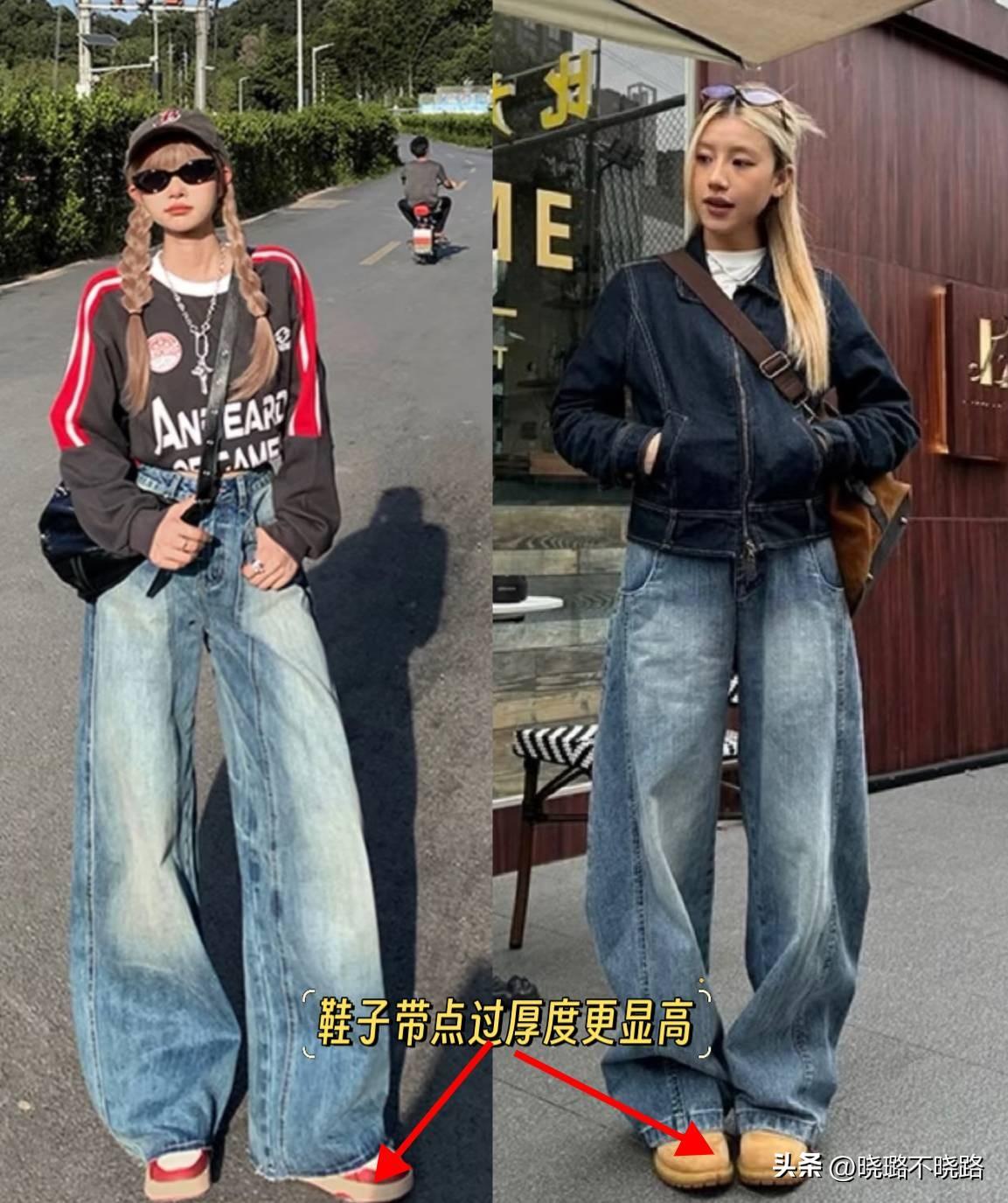 秋天穿牛仔彎刀褲,鞋子儘量帶點厚度,但是不能太過於笨重,鞋底在3cm左右,既能夠達到增高的效果,又可以擺脫褲腿堆積的煩惱。