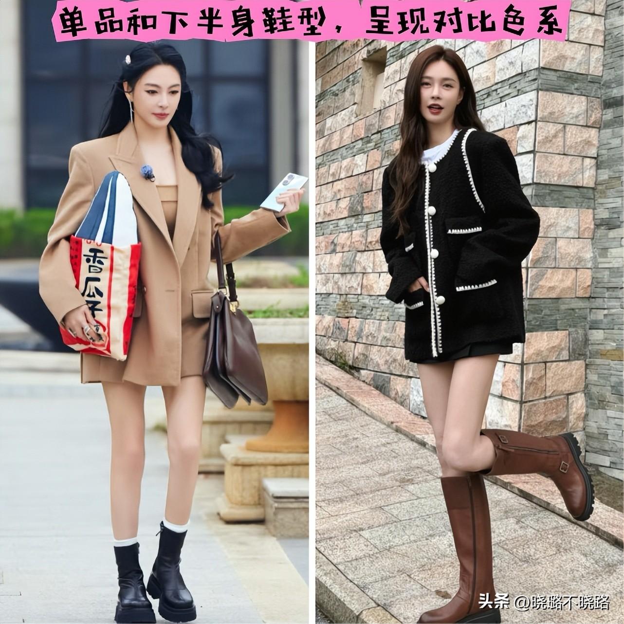 不管是長靴還是短靴,又或者是加入了襪子的元素,我們最終的比例都是呈現的比較具有優勢的效果,在這個時候就推薦大家色系運用的話還是要選擇一些對比的色調哦,這樣在視覺上的分割感會更爲明顯。